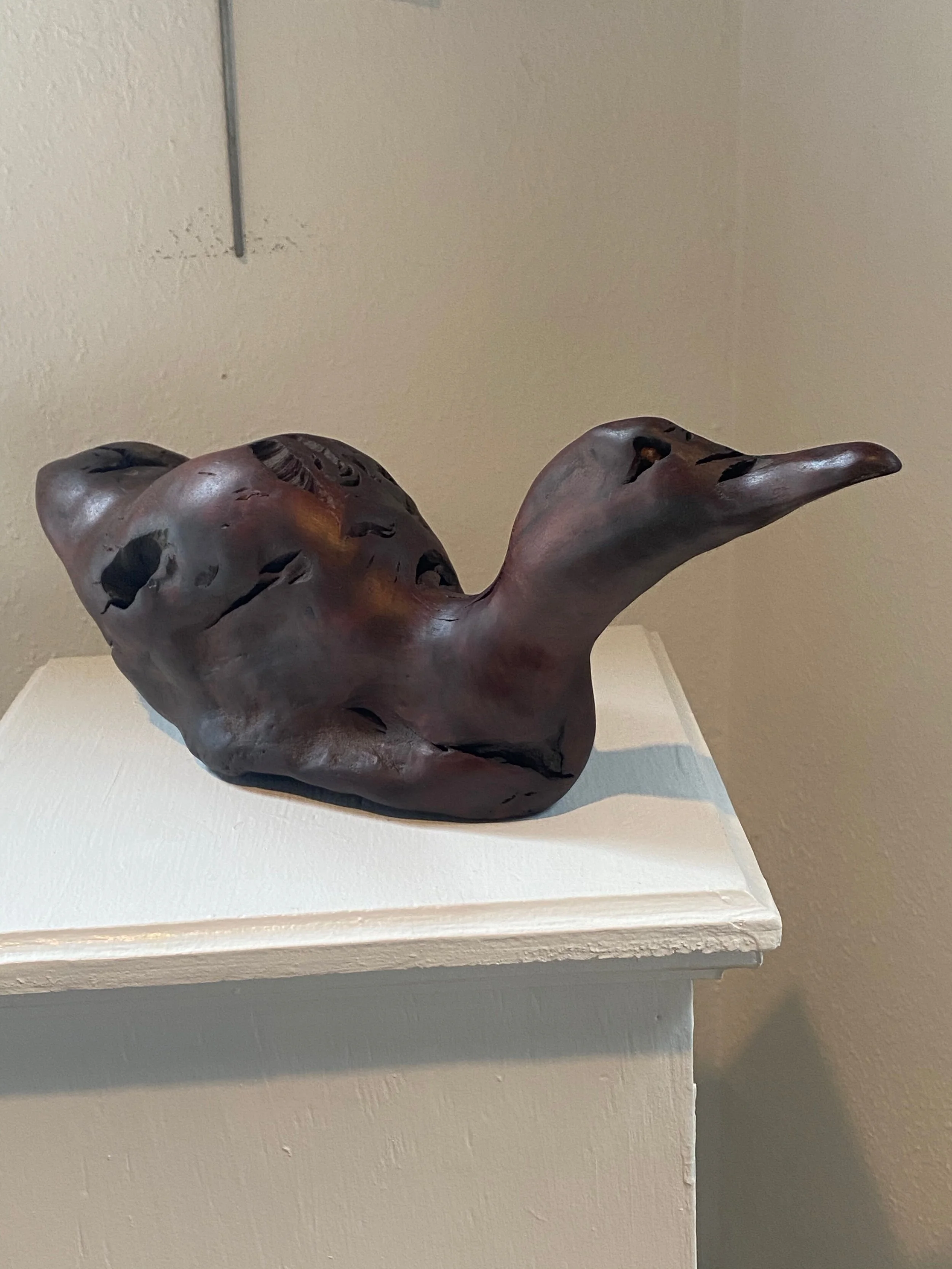 “Wood has warmth, like birds and humans. The artist has lovingly transformed a piece of driftwood into a bird that exists in spite of the trials of life. With ruffled feathers and scars the bird, like us, perseveres.” - Jim Adcock