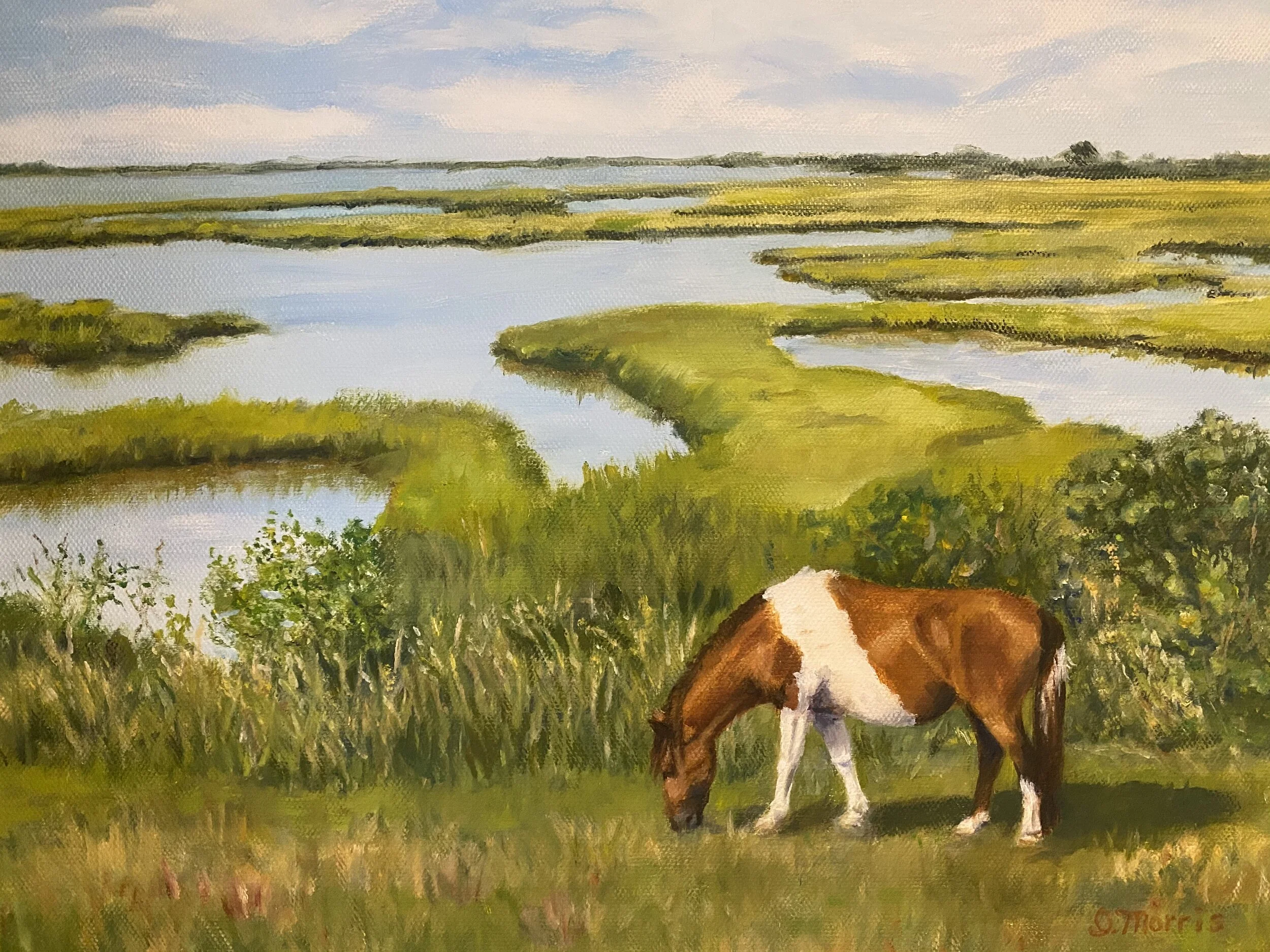 “Most important, the pony is rendered perfectly. The pony’s anatomy, colors and shading make it come alive. This is essential because the pony leads the viewer to his environment, also rendered with perfection. A lush, peaceful, quiet work.” - Jim Adcock